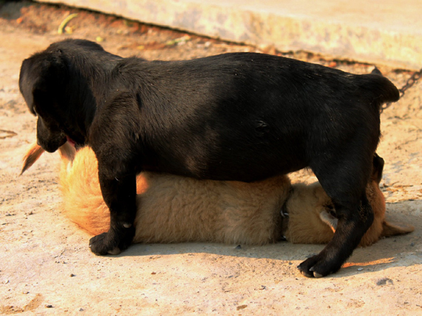 :街頭一黑一黃倆狗嬉戲,小黑把小黃壓制得服服帖帖,力量懸殊木辦法。