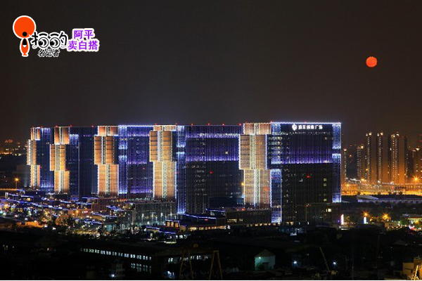 夜幕下的和豐廣場,一輪紅月掛在空中,美輪美奐。