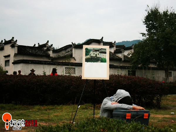 美術生寫生,畫中的風景與身后風景交相呼應。興許是畫累了,一頭趴在了畫具箱上。