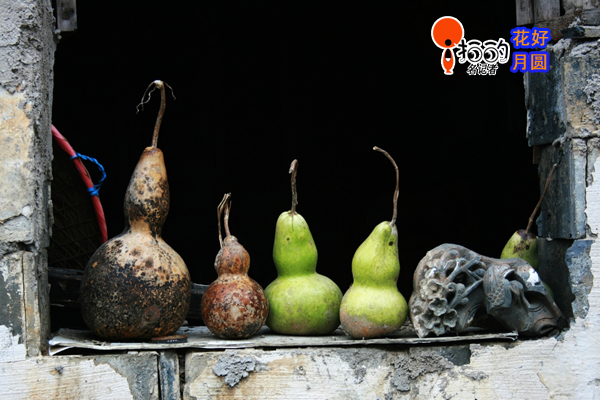 幾個葫蘆被主人零散地放在破舊的窗臺上,前面幾個葫蘆一身的綠早已褪去,在不知不覺中也風干了,輕了很多,稍稍晃動,能聽得見里面干結(jié)脫落的籽嘩啦啦響。