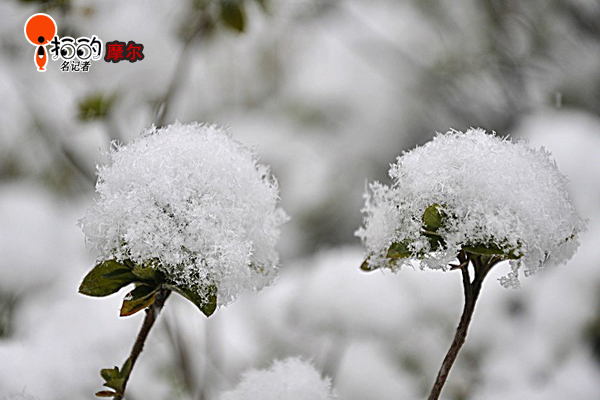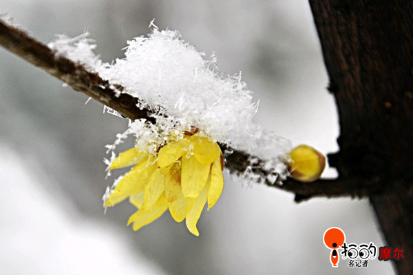 雪來了,黃色的花朵被雪花點綴得分外美麗。寒風(fēng)颼颼,視野潔白,這幾點顏色分外醒目。