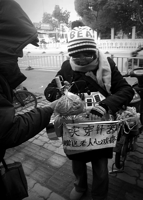 2013.1.10,雪后的第一個晴天,清晨,大娘站立街頭,做點小生意——穿針器,家有老人的可以備一個。