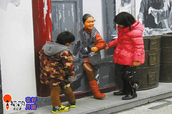 在鼓樓步行街,孩子們對(duì)一個(gè)新設(shè)置的破墻而出的雕像很好奇,忍不住上去摸摸,好像在試試真假。