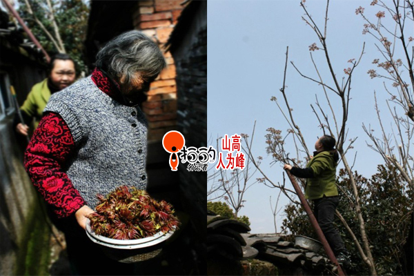 2013、3、25,多云轉晴。初寸長枝頭,春月香椿嫩,登高采椿芽,嫩椿炒蛋香。