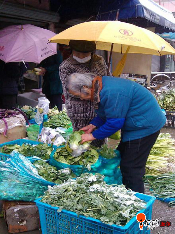 中,老爺爺為挑菜的老奶奶打傘,這一刻,見(jiàn)證真情。