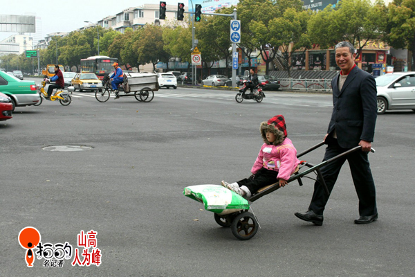 馬路上,大爺推著車,載著大米,悠然信步,小女孩坐“專車”,一路淡定看風(fēng)景。