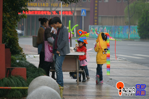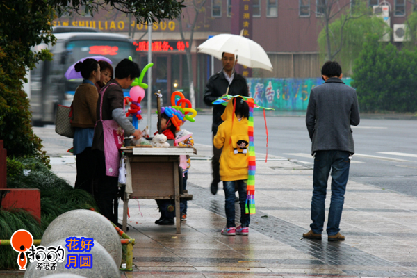 周末,日湖公園,突然下起雨來,幾個(gè)小女孩把氣球做成了帽子戴起來,小男孩也把風(fēng)箏也蓋在自己頭上當(dāng)作雨具。