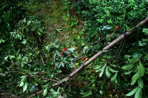 2013、6、14、陰雨。余姚,新豐河邊公園里,楊梅未熟,樹(shù)枝已斷,口水的君子們,楊梅雖好吃,還請(qǐng)手下留情。