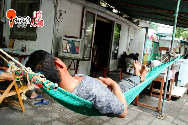 船老大躺在用漁網(wǎng)自制的吊床上,邊看電視邊休息,悠然悠閑,再過(guò)半月,開漁節(jié)到了,又將出海......