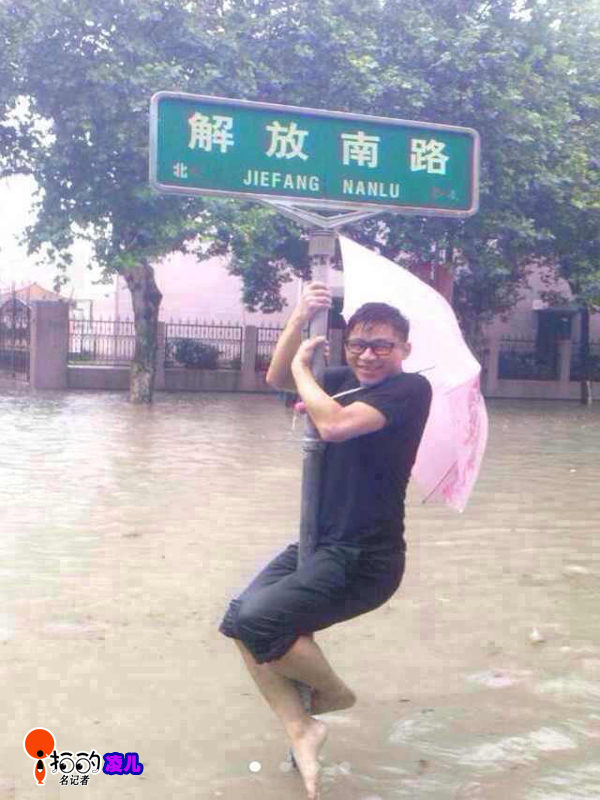 解放南路,小伙子面對(duì)災(zāi)情十分樂觀,還跳起了“水中鋼管舞”。