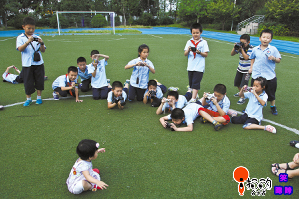 江東第二實(shí)驗(yàn)小學(xué)的操場(chǎng)上,小攝影師們包圍住了小模特,各種拍攝姿勢(shì)都有。