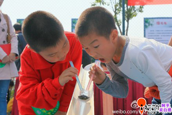 甲魚賽跑比賽,兩個小朋友用吸管吹幫助甲魚跑得更快。10月27日拍于鄞州。