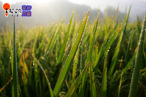 金色的秋天,稻田的稻子熟了,秋天的晨霧中,露水滴落在禾尖上,晶勻剔透的美!