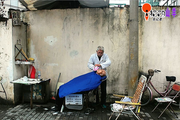 中國寧波網(wǎng)“i拍”記者山羊:一個電推,一把剪刀,一把梳子和幾把磨得發(fā)亮的剃刀,幾個熱水壺,再加幾張破舊的藤椅木凳,這簡簡單單的工具,就是街頭理發(fā)攤的全部家當。