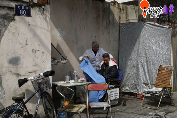 車水馬龍的城市里,舊時的記憶都在消退。曾經(jīng)隨處可見的街頭理發(fā)師,如今也就在小巷里偶爾能撞上一兩回,圖為文昌街上的路邊理發(fā)攤。(攝于2014.3.9)