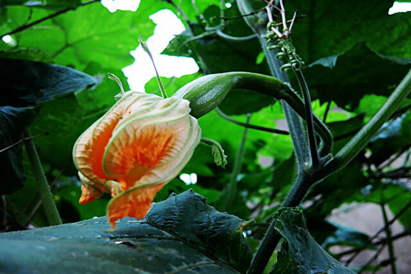 七月,南瓜花開(kāi)在院墻上