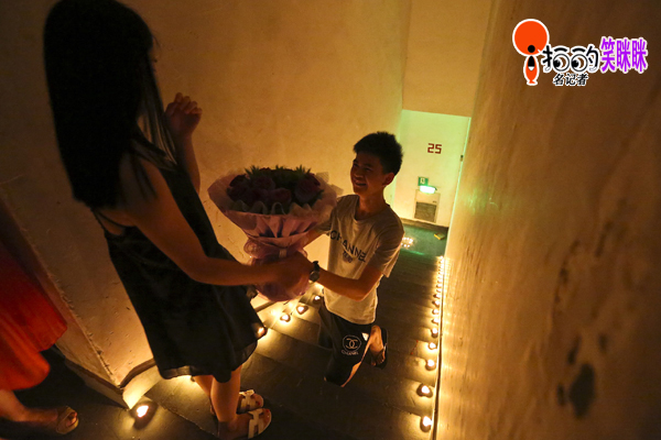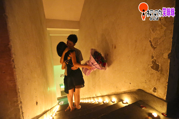 上前一問得知小伙子姓周,今年20歲來自安徽,租住在這座大樓里,在寧波做手機(jī)業(yè)工作。他想在今年77情人節(jié)來臨前給女朋友一個驚喜,特意從網(wǎng)上訂購了很多蠟燭和鮮花,準(zhǔn)備晚上向他的女朋友求婚。但因?yàn)闃歉唢L(fēng)大,蠟燭很難點(diǎn)燃,這時有幾位住在這個樓的小姑娘都上來給小伙子幫忙,使這個浪漫求婚夜更加溫馨感人。