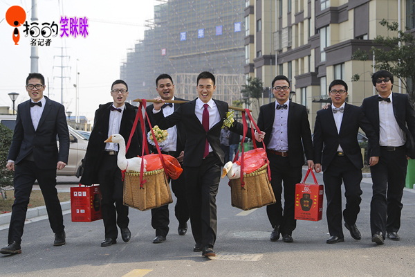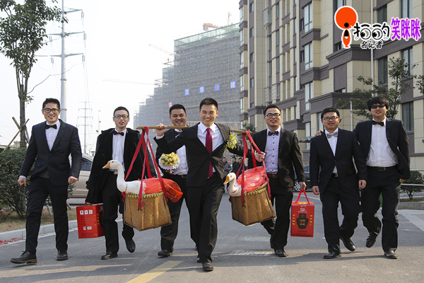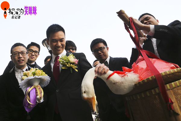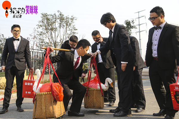 中國寧波網(wǎng)“i拍”記者笑瞇瞇:昨天,在鄞州高橋鎮(zhèn)的一個小區(qū),新郎張先生挑著一對大白鵝,被伴郎們簇擁著去迎親。據(jù)了解,新郎新娘都是寧波本地人。新郎挑的籮筐里,除了大白鵝,還有黃魚、熗蟹等物。挑著大白鵝去娶親,原是寧波傳統(tǒng)婚俗,不過如今在現(xiàn)實中越來越少見了。