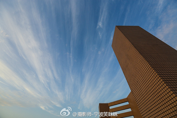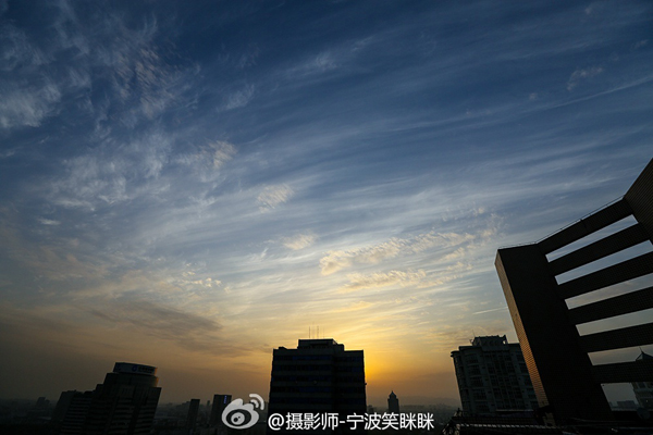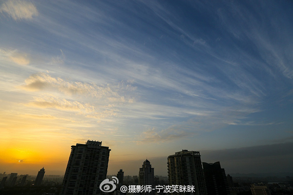 傍晚日落時分,寧波高空明麗的蔚藍色,流動的云朵在空中隨風(fēng)翩翩起舞,時而金黃,時而潔白,時而象火一樣紅,很少看見這么美的天空。