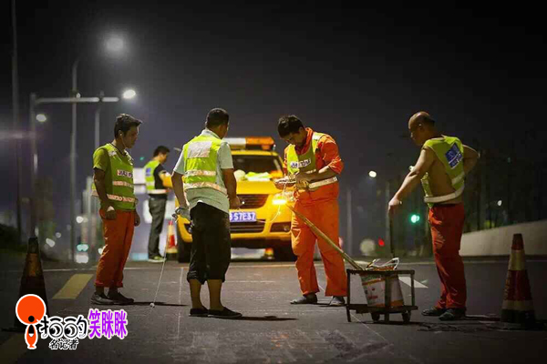 深夜,依舊在馬路上工作的標(biāo)線工。(拍客攝于鄞州廣德湖路)