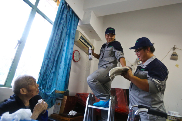 中國寧波網(wǎng)“i拍”記者笑瞇瞇:9月28日一早,海曙區(qū)寧波愛心養(yǎng)老院里,“安居易佰快修”3個80后小伙子給老人們居住的房間里的空調進行深度的清洗和高溫消毒,他們了解到該養(yǎng)老院的空調已經(jīng)有5、6年沒有進行維護和保養(yǎng),為了讓老人們有一個健康幸福的晚年,小伙子們特地聯(lián)系了寧波愛心養(yǎng)老院,在國慶節(jié)前夕將39臺空調全部免費消毒清洗,讓老人們度過一個舒適的國慶佳節(jié)!