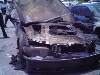 事件發(fā)生地點(diǎn)是位于蒼水街上的聯(lián)誼賓館附近,當(dāng)時(shí)車(chē)主張先生正在車(chē)內(nèi)休息,睡了一段時(shí)間以后,被濃煙熏醒,感覺(jué)非常悶。睜眼一看,車(chē)內(nèi)煙霧騰騰。他趕緊拉開(kāi)車(chē)門(mén)從車(chē)?yán)锾恿顺鰜?lái),但此刻整輛車(chē)已烈焰騰空。據(jù)車(chē)主介紹,這輛寶馬745Li型是他在2003年花145萬(wàn)多元買(mǎi)來(lái)的,加上稅費(fèi)等費(fèi)用,共花了170萬(wàn)多元。停在邊上的一輛浙A牌照的標(biāo)致206右車(chē)門(mén)也被燒毀。