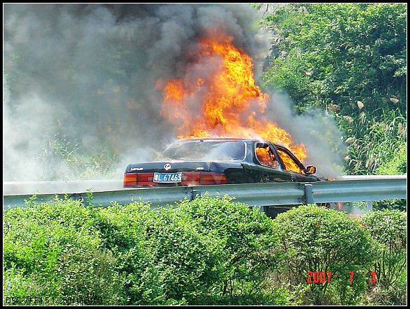 這一張照片是網(wǎng)友tintin007在寧波北侖區(qū)大海線(xiàn)春曉往大碶方向路段拍到的。這輛粵L牌照的雷克薩絲在進(jìn)隧道口處突然發(fā)生自燃,所幸的是司機(jī)及乘客及時(shí)逃脫才沒(méi)有造成人員傷亡。
