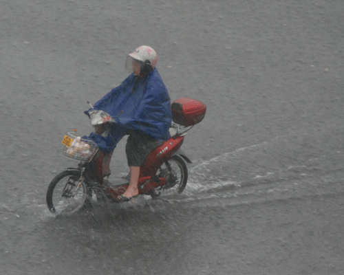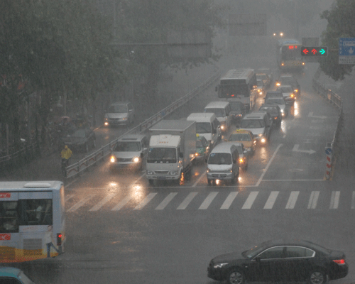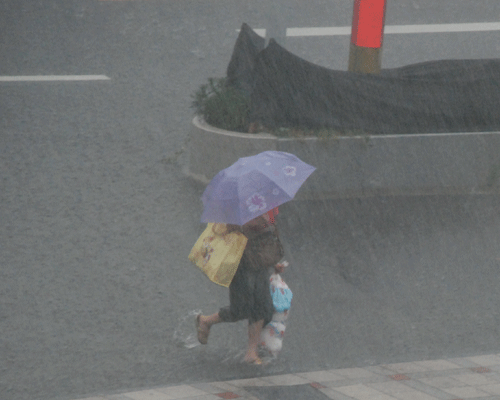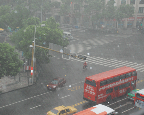 馬路上已經(jīng)有了很深的積水。路上的行人都沒有準(zhǔn)備。