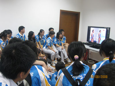 休息室空間有限,但這絲毫沒有阻擋志愿者們助威中國隊(duì)的熱情,一些志愿者甚至鋪好報紙,坐在地上觀看比賽。第一跳,向前翻騰半周---屈體,郭晶晶與吳敏霞很好地完成了動作,得到了52.80的高分,我們與所有在水立方觀賽的中國觀眾一起喝彩。但是,當(dāng)看到美國隊(duì)與俄羅斯隊(duì)漂亮的起跳、翻騰與屈體落水時,我們頓時緊張了。第一跳竟然出現(xiàn)3個隊(duì)同分?jǐn)?shù),美俄兩國對手的實(shí)力不可低估,比賽非常激烈。然而,從第二跳起,中國隊(duì)一路領(lǐng)先,從57.60分到81.09分,每一次起跳與落水都牽動著在場每一位志愿者的心!拔覀冓A定了!”最后一跳還沒結(jié)束,一位志愿者就自豪地呼喊著。毫無疑問,大家對中國跳水夢之隊(duì)充滿信心。