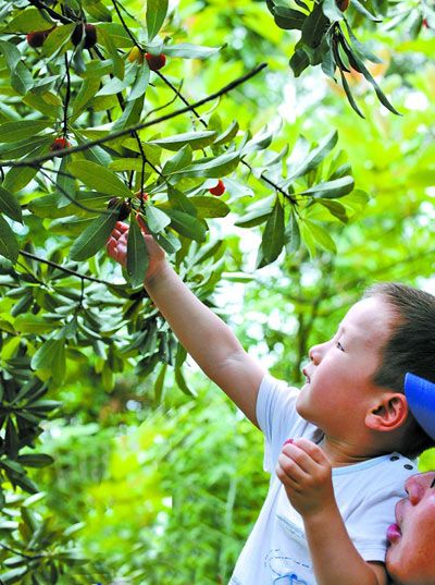 圖:一名小游客正在摘楊梅。記者 王增芳 通訊員 龔姚 攝