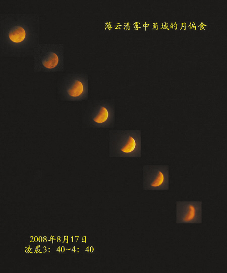 隨著時間的推移,陰影面在不斷擴大,但月亮越來越接近西方地平線,它的亮度也越發(fā)暗淡下來。由于霧氣重,使得本應該是暗紅色的陰影面難以見到,最后連剩下的月亮也看不見了。雖然觀察條件不怎么理想,但這場見不到結束的月偏食過程,還是讓大家感到愉悅。 |
