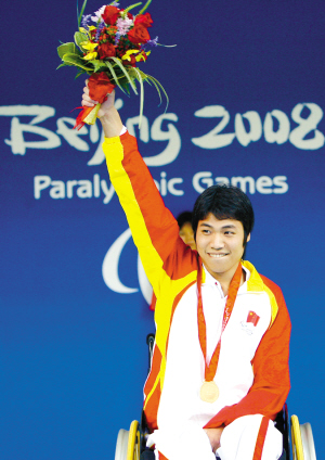 9月7日,浙江選手杜劍平在國(guó)家游泳中心進(jìn)行的北京2008年殘奧會(huì)S3級(jí)男子100米自由泳決賽中以1分35秒21的成績(jī),打破世界紀(jì)錄并獲得冠軍,這是中國(guó)代表團(tuán)在北京殘奧會(huì)上獲得的首枚金牌。新華社