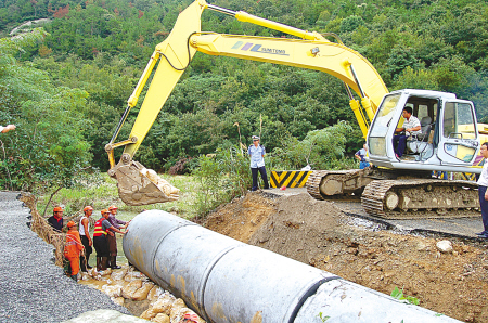 據(jù)負責(zé)搶修峙后段的象山縣公路段副段長錢挺介紹,5日深夜,一組路政工作人員趕到泗長線時看到,被山洪深深扯裂的一道近6米寬的口子橫亙在公路上,近4米高的路基已被山洪沖得無影無蹤,山洪沖垮柏油公路后直沖入海。為此,幾十位路政搶修工作人員在迅速清理完靠前的大面積塌方后,再用一袋袋裝滿黃泥的編織袋填埋缺口,等到一輛輛載著水泥涵管的車輛陸續(xù)趕到后,各類大型機械設(shè)備很快投入最后的搶修工作……