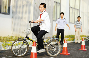 繞樁結(jié)束后,自行車要停在劃好的兩條線之間,前后車輪不得軋線,否則也視為不合格。