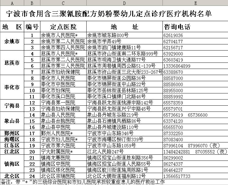 寧波市衛(wèi)生局成立含三聚氰胺嬰幼兒配方奶粉重大安全事故醫(yī)療救治有關(guān)工作領(lǐng)導(dǎo)小組和專家組。寧波市衛(wèi)生局黨委書記、局長何一天擔(dān)任領(lǐng)導(dǎo)小組組長,王仁元、干愛玲、鄒鳴飛等副局長為副組長,辦公室、規(guī)財處、醫(yī)政與中醫(yī)處、婦社(農(nóng)衛(wèi))處、疾控處、衛(wèi)監(jiān)處負(fù)責(zé)人為成員;專家組組長由市婦兒醫(yī)院副院長、兒內(nèi)科主任醫(yī)師邱海燕擔(dān)任,泌尿科、腎內(nèi)科、兒內(nèi)科、B超影像科、中醫(yī)兒科、特檢科、透析室等相關(guān)專家為成員。
