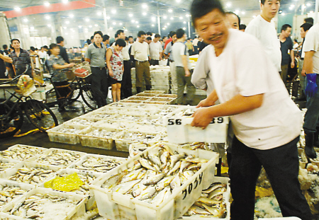 記者在江東水產(chǎn)批發(fā)市場(chǎng)看到,帶魚、鯧魚、鰻魚、大小黃魚擺滿了攤頭,交易相當(dāng)紅火!皞(gè)頭比去年的大,品質(zhì)更好!倍嗄杲(jīng)營水產(chǎn)的市場(chǎng)負(fù)責(zé)人戎永敢稱,開漁第一天,由于受臺(tái)風(fēng)“森拉克”影響,我市只有一半漁船出海,因此“第一網(wǎng)”到港時(shí)間比往年推遲了一天,但今年第一航次捕獲的魚貨普遍量多貨好,主要品種為帶魚、鯧魚、馬鮫魚等。像野生大黃魚有1公斤重,一下子就被甬城酒店買走。從交易情況看,盡管總體價(jià)格變化不大,但部分品種已受到了“開漁第一網(wǎng)”的沖擊,平均批發(fā)價(jià)格下降了5%-8%。昨晚江東水產(chǎn)市場(chǎng)共成交300噸水產(chǎn),其中東海水產(chǎn)超過六成多。