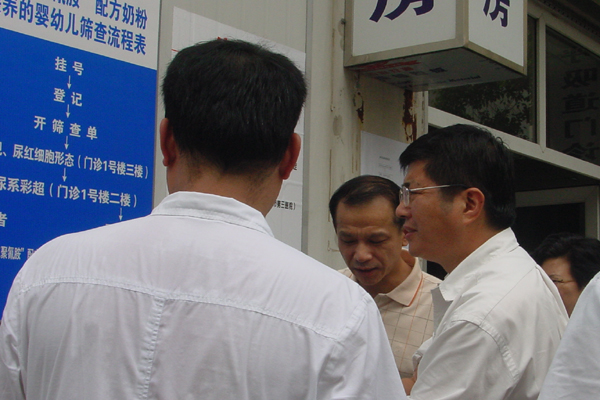成岳沖來到婦兒醫(yī)院開設的專門診區(qū),關切地詢問患兒家長,“哪里來的?”“孩子現(xiàn)在情況怎么樣?”在B超室里,成岳沖把一個小寶寶抱上B超檢查床上,一邊仔細看著B超顯示屏,一邊向家長詢問有關情況。從孩子家長口中得知,孩子已經(jīng)在西門社區(qū)衛(wèi)生服務中心經(jīng)過了初步篩查,中心出具了《食用含三聚氰胺嬰幼兒配方奶粉患兒轉診單》,家長就是憑著這張轉診單來到婦兒醫(yī)院的。正好,另一臺B超檢查完畢,一位寶寶的家長顯得很開心,“昨天在社區(qū)檢查,B超顯示我家小寶寶有很小的小顆粒,今天這里的張醫(yī)生給我們小寶寶細細查了,說沒事,這說明我家寶寶安全了!背稍罌_對患兒家長說:“大家都放心,我們一定為所有前來檢查的小朋友進行最細致的檢查,為確診的小寶寶進行最精心的治療。”