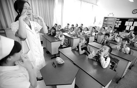 昨天下午,寧波光明眼病醫(yī)院的醫(yī)護(hù)人員來(lái)到江東區(qū)外國(guó)語(yǔ)實(shí)驗(yàn)小學(xué),指導(dǎo)小學(xué)生學(xué)習(xí)新版眼保健操。據(jù)了解,新版眼保健操在舊版的基礎(chǔ)上進(jìn)行了部分修改,操作更簡(jiǎn)單,音樂(lè)也更加時(shí)尚,深受試學(xué)學(xué)生的歡迎。(丁 安 崔燕波 攝)