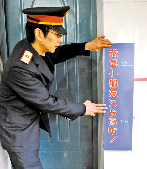 昨日,寧波火車南站一位工作人員在站內(nèi)標(biāo)高兒童火車票身高線。據(jù)了解,鐵道部決定自12月21日起,將乘坐火車時購買兒童半價票的參照身高標(biāo)準(zhǔn)調(diào)整為1.1米至1.5米。相比原來1.1米至1.4米的標(biāo)準(zhǔn),新標(biāo)高的上限高出了10厘米。