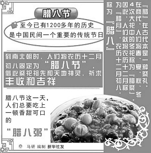 新華社北京1月2日專電(記者李文)“小孩小孩你別饞,過了臘八就是年!保痹拢橙站褪桥D八,這是臘月很重要的一個節(jié)日,這天過后,人們就開始忙年了。而這一天,根據(jù)我國的傳統(tǒng)則必要喝臘八粥。中醫(yī)認為,這種習(xí)俗對身體非常有益。