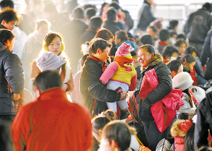 春運昨天啟動,在鐵路南站候車廳里,兩個旅客正在溫暖的陽光下逗孩子,等待前往安徽阜陽的列車發(fā)車。記者 劉波 攝
