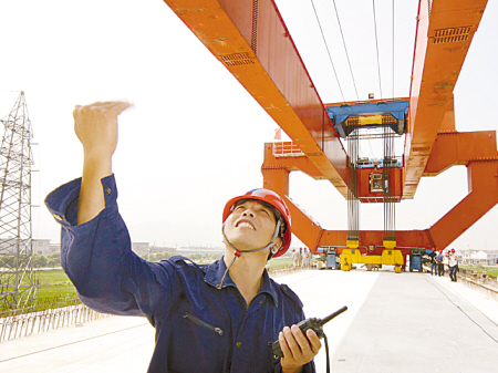昨天,中鐵13局的建設(shè)者正加緊在甬臺(tái)溫鐵路奉化段的寧波特大鐵路橋施工區(qū)架梁。(胡建華 王校美 攝)