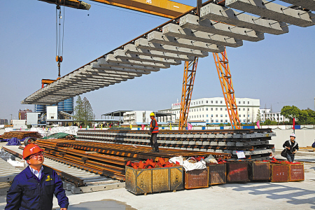 軌道交通2號線一期工程鄞州大道站黃隘出入段線,工人正在吊裝軌排。(胡建華攝)