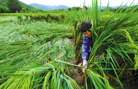 昨天上午,奉化市尚田鎮(zhèn)廣渡村農(nóng)民王志飛正在將倒伏的四畝單季雜交水稻扶正綁定。(嚴龍吳培維王加廷攝)