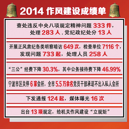加強會所整治、禁止公款送禮、通報違紀案例……過去一年,這一系列的新氣象贏得了甬上百姓的擊掌稱贊。自中央八項規(guī)定出臺以來,寧波市強力開展各項專項整治,共查處違反中央八項規(guī)定精神問題811件、處理536人,其中去年一年查處問題333件、處理283人。全市紀檢監(jiān)察部門以從嚴執(zhí)紀、狠剎“四風”的高壓態(tài)勢,形成了對不正之風“零容忍”的新常態(tài)。