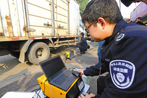 | 昨天上午,執(zhí)法人員正在對一輛疑似超標卡車進行尾氣檢測! (記者 徐能 攝) |