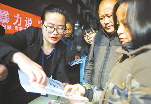 | 昨天,江東白鶴街道周宿渡社區(qū)在果品批發(fā)市場舉行“對家庭暴力說‘NO’”法律宣傳活動。 。ǘ“ 張朝亞 攝) |