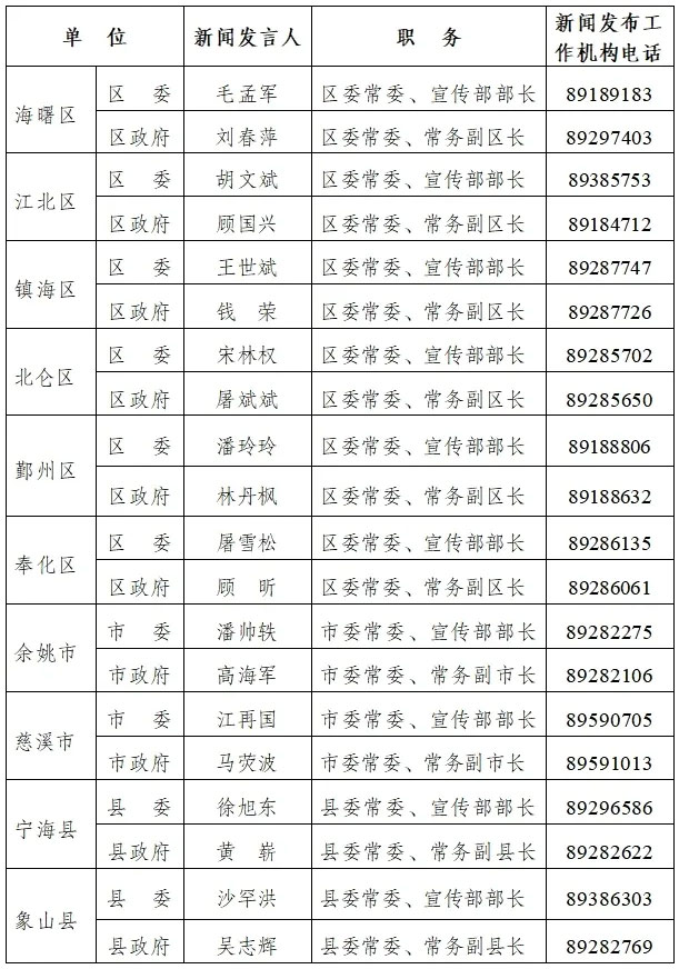 寧波市各區(qū)(縣、市)黨委、政府新聞發(fā)言人名單及新聞發(fā)布工作機(jī)構(gòu)電話