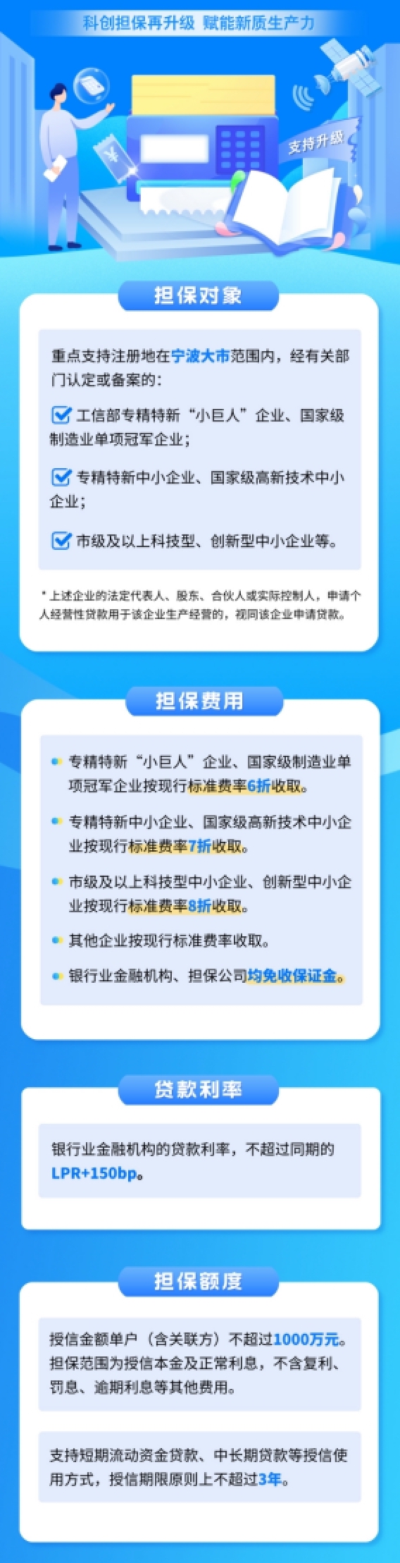 8月8日,記者從寧波市融資擔(dān)保有限公司獲悉,為積極響應(yīng)財政部、科技部、工業(yè)和信息化部、金融監(jiān)管總局四部門聯(lián)合實(shí)施支持科技創(chuàng)新專項(xiàng)擔(dān)保計(jì)劃及市級相關(guān)部門要求,市融資擔(dān)保公司推出“惠科擔(dān)”專項(xiàng)政策性信貸產(chǎn)品,對科創(chuàng)型中小企業(yè)的擔(dān)保服務(wù)進(jìn)行升級。根據(jù)企業(yè)認(rèn)定,實(shí)施差異化擔(dān)保費(fèi)率優(yōu)惠,擔(dān)保費(fèi)率可以打六到八折,給企業(yè)省下一筆“真金白銀”;擔(dān)保額度可達(dá)1000萬元,支持科創(chuàng)型中小企業(yè)的發(fā)展。