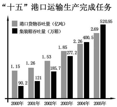 到2005年12月19日,寧波港集裝箱吞吐量突破500萬(wàn)標(biāo)準(zhǔn)箱,全年達(dá)到520.95萬(wàn)標(biāo)準(zhǔn)箱,保持大陸沿海主要港口第四的地位,全球排位有望進(jìn)入15強(qiáng)。至此,“十五”期間,寧波港集裝箱吞吐量以年均42%的速度實(shí)現(xiàn)跨越式增長(zhǎng),吞吐量5年內(nèi)增長(zhǎng)了4.7倍。貨物吞吐量2000年為1.15億噸,去年達(dá)到2.69億噸,年均增長(zhǎng)18.6%,列大陸沿海主要港口第二位、全球第四位。